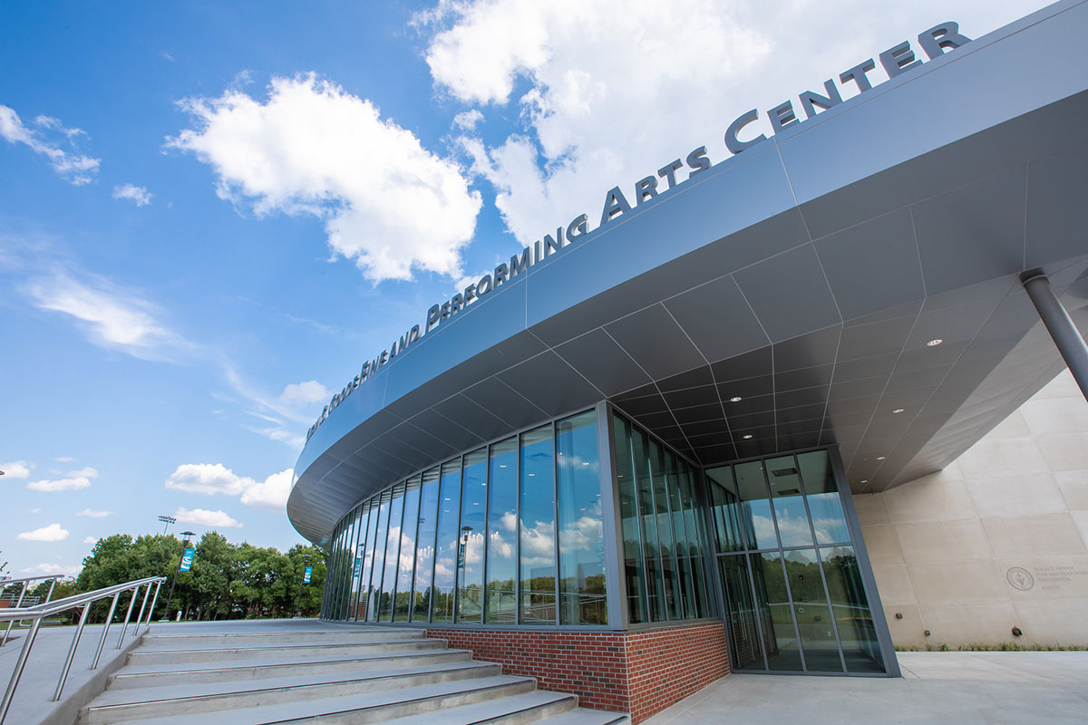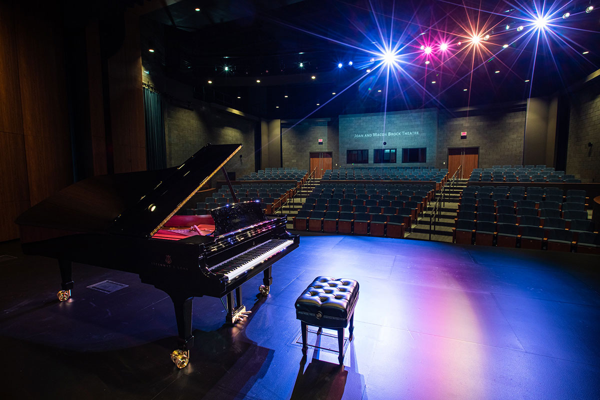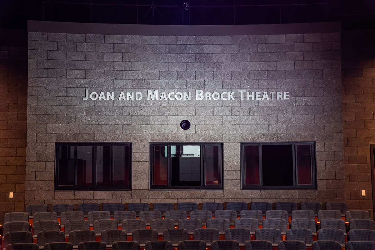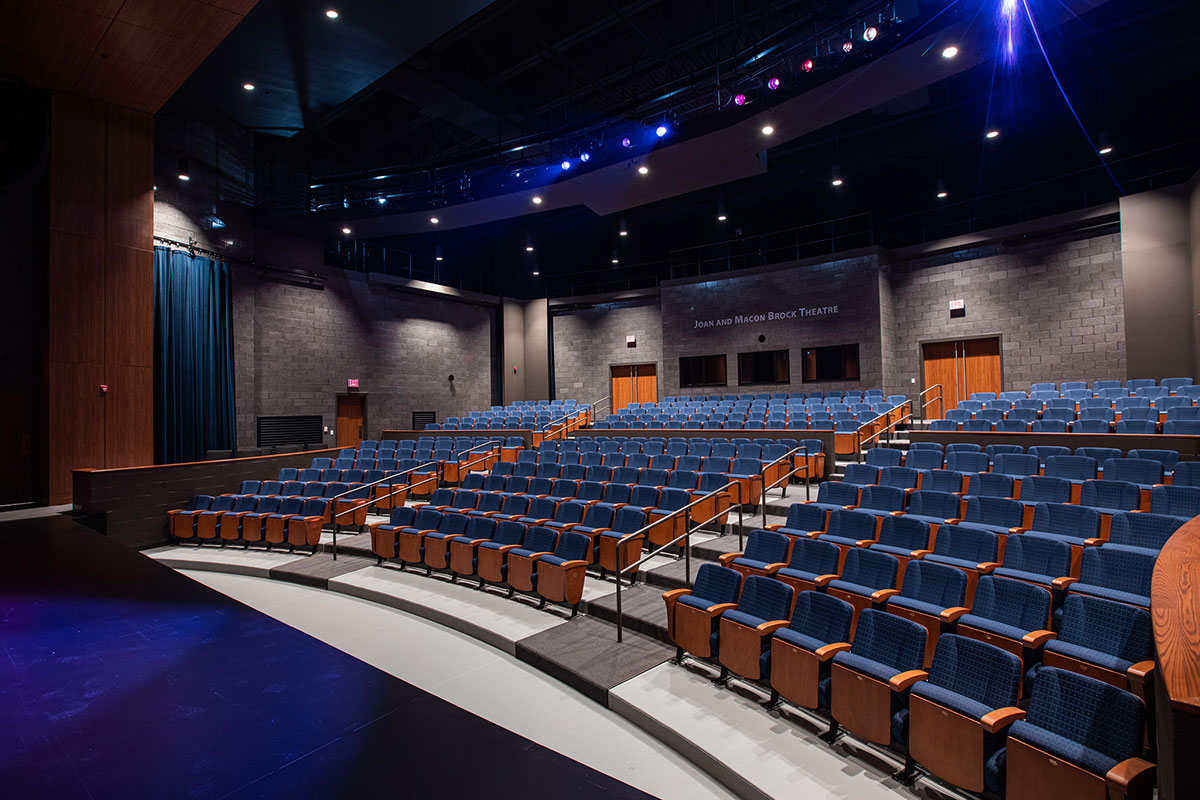 Located prominently near the main entrance of campus, the 23,200-square-foot facility features the impressive glass-enclosed Eleanor and Henry Watts Grand Lobby and Gallery and the 325-seat Joan and Macon Brock Theatre. Support spaces ring the stage, including a scene shop, dressing rooms, green room, costume, prop, and equipment storage. A plaza for outdoor programming overlooks the Susan Beverly Grand Terrace and Pond.