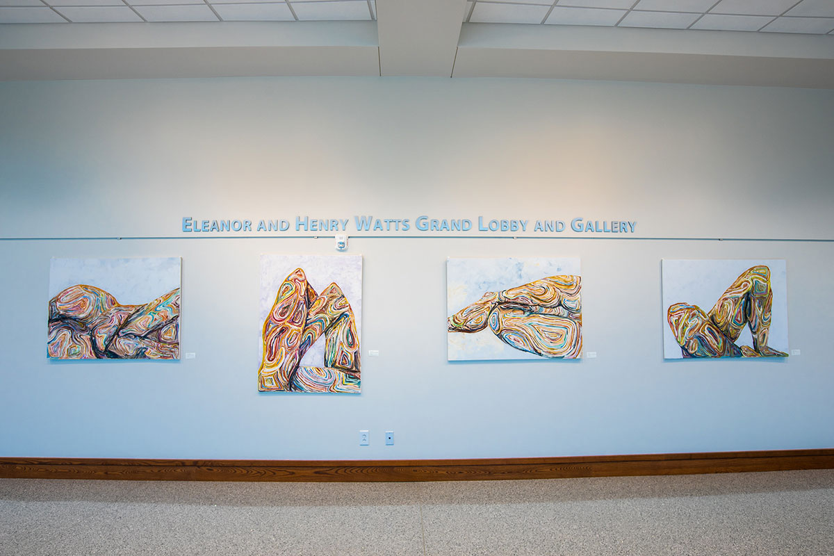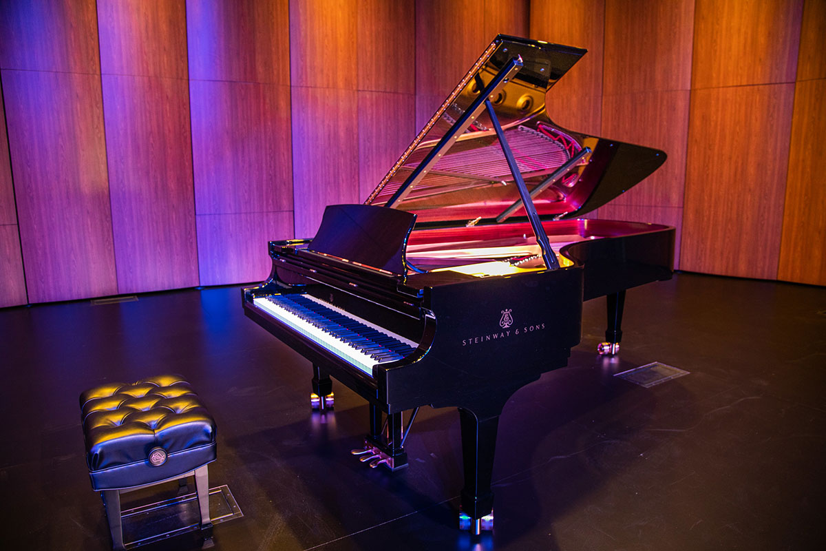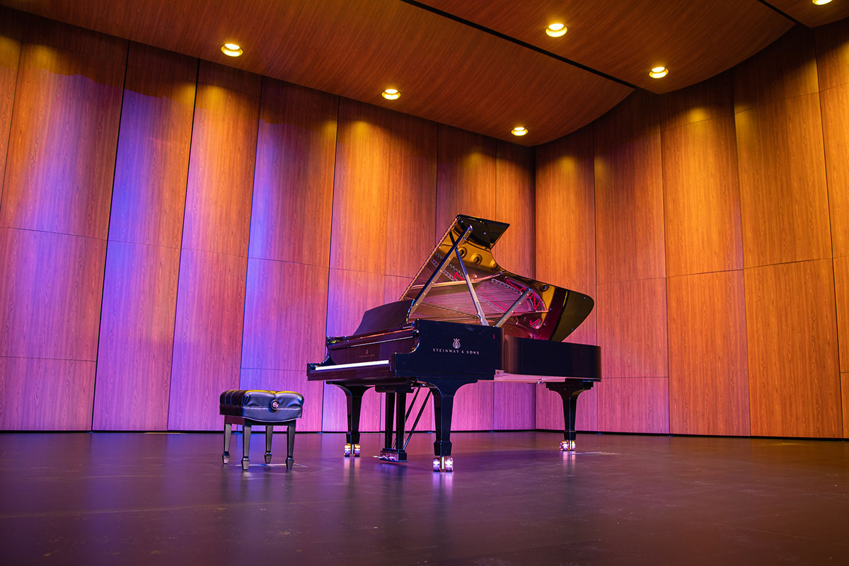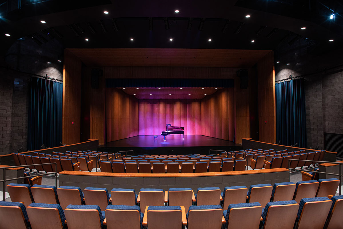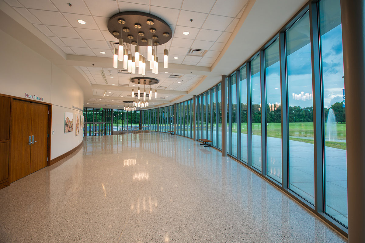 Located prominently near the main entrance of campus, the 23,200-square-foot facility features the impressive glass-enclosed Eleanor and Henry Watts Grand Lobby and Gallery and the 325-seat Joan and Macon Brock Theatre. Support spaces ring the stage, including a scene shop, dressing rooms, green room, costume, prop, and equipment storage. A plaza for outdoor programming overlooks the Susan Beverly Grand Terrace and Pond.